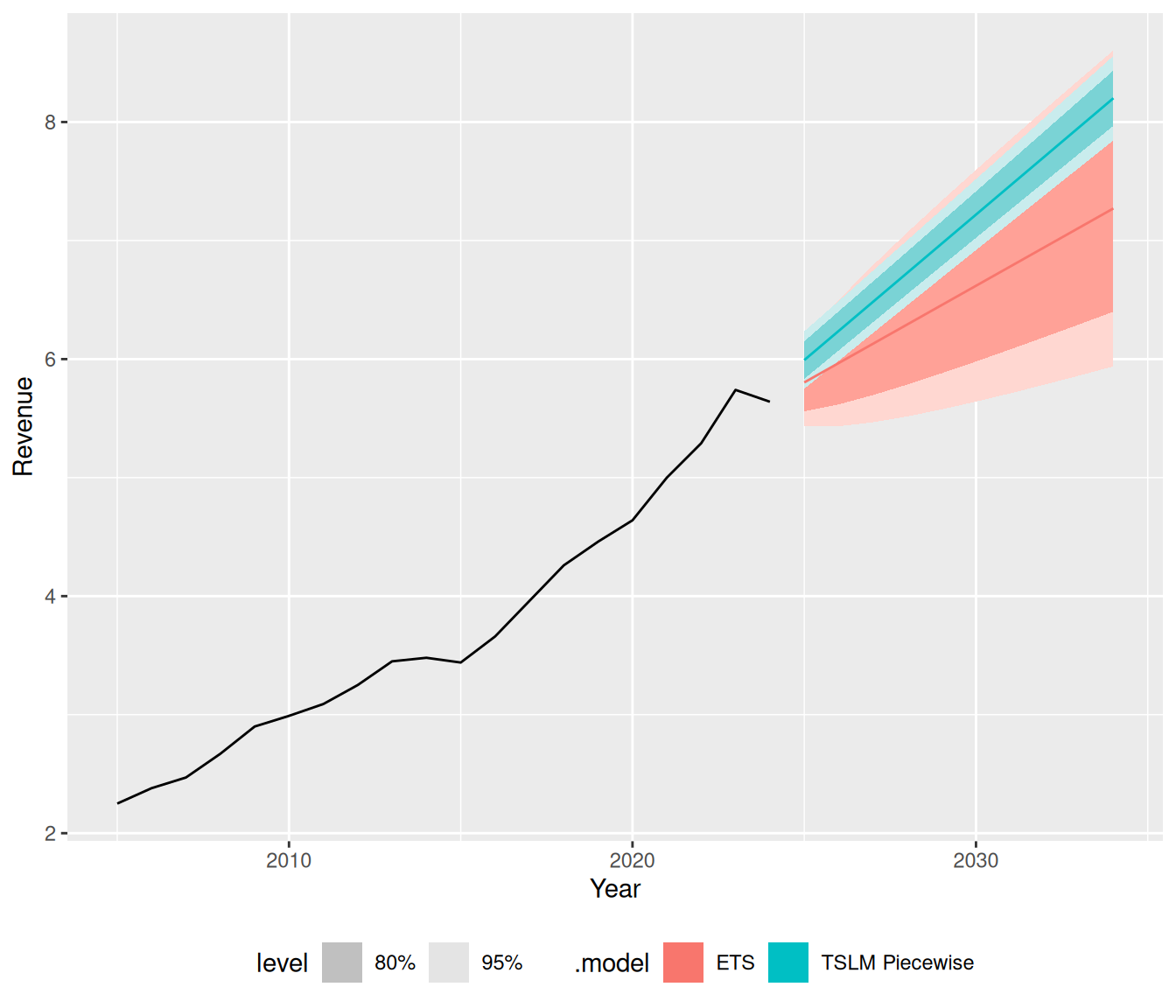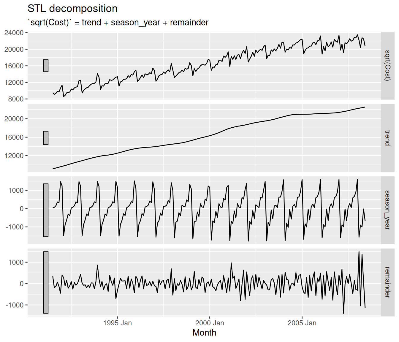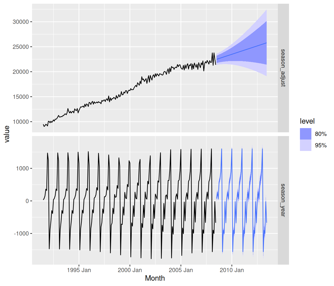 We usually model/forecast trend (\(T\)) and remainder (\(R\)) together with a single model.